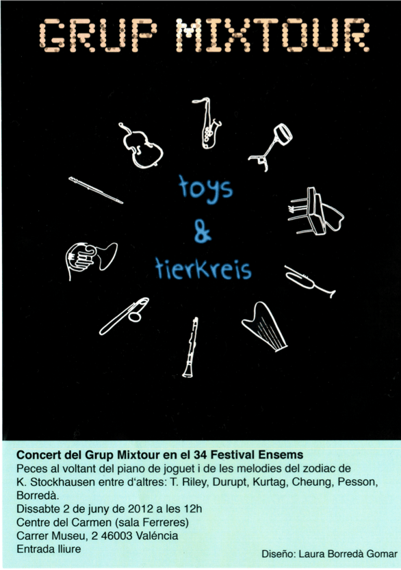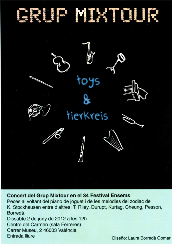 El nuevo proyecto musical del Grup Mixtour está basado en los juguetes como instrumentos musicales, por una parte, y en la obra Tierkreis de Stockhausen, por otra. ¿Por qué los juguetes? Estos nos recuerdan al niño que llevamos dentro y por ello los sentimos cercanos y lejanos a la vez. También la combinación de juguetes e instrumentos musicales está llena de contradicciones: desde lo naíf hasta lo grotesco, pasando por el efecto cómico que produce ver a adultos tocando instrumentos más pequeños de lo normal. Por su parte, Tierkreis es una pieza musical que consiste en doce melodías basadas en los signos del Zodíaco. El concierto se articula así entre estas dos ideas para formar un espectáculo escénico a la vez lúdico y misterioso.