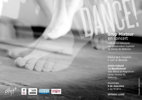Grup Mixtour presenta un nuevo espectáculo escénico reuniendo música y danza en directo. Fiel a la estética del grupo, este nuevo viaje musical es también un viaje en el tiempo que combina danzas barrocas con danzas contemporáneas. ¿Gavota? ¿bossa-nova? ¿mambo? ¿minuetto? ¿Vibrarían los pelucas blancas con el ritmo de la gigue tanto como nosotros con el de la trance? Todo esto y mucho más en el nuevo espectáculo del Grup Mixtour en colaboración con el Conservatorio Superior de Danza de Valencia.