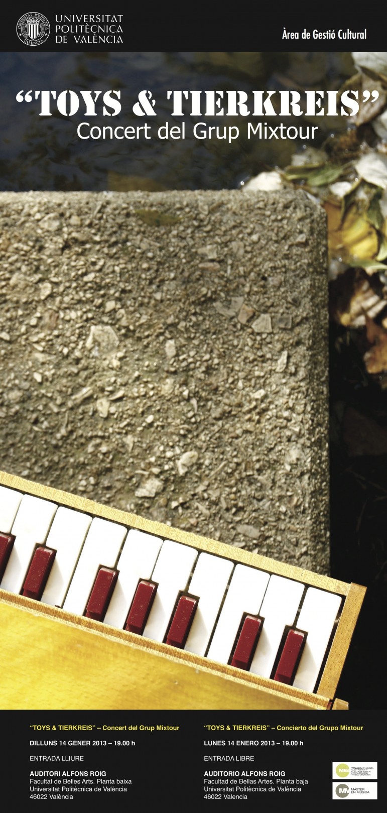 Este proyecto musical de Grup Mixtour está basado en los juguetes como instrumentos musicales por una parte y en la obraTierkreis de K. Stockhausen por otra. ¿Por qué los juguetes? Éstos nos recuerdan al niño que llevamos dentro y por ello los sentimos cercanos y lejanos a la vez. También la combinación de juguetes e instrumentos musicales está llena de contradicciones: desde lo naïf hasta lo grotesco, pasando por el efecto cómico que produce ver a adultos tocando instrumentos más pequeños de lo normal. Por su parte, Tierkreis es una pieza musical que consiste en 12 melodías basadas en los signos del Zodíaco. El concierto se articula así entre estas dos ideas para formar un espectáculo escénico a la vez lúdico y misterioso.